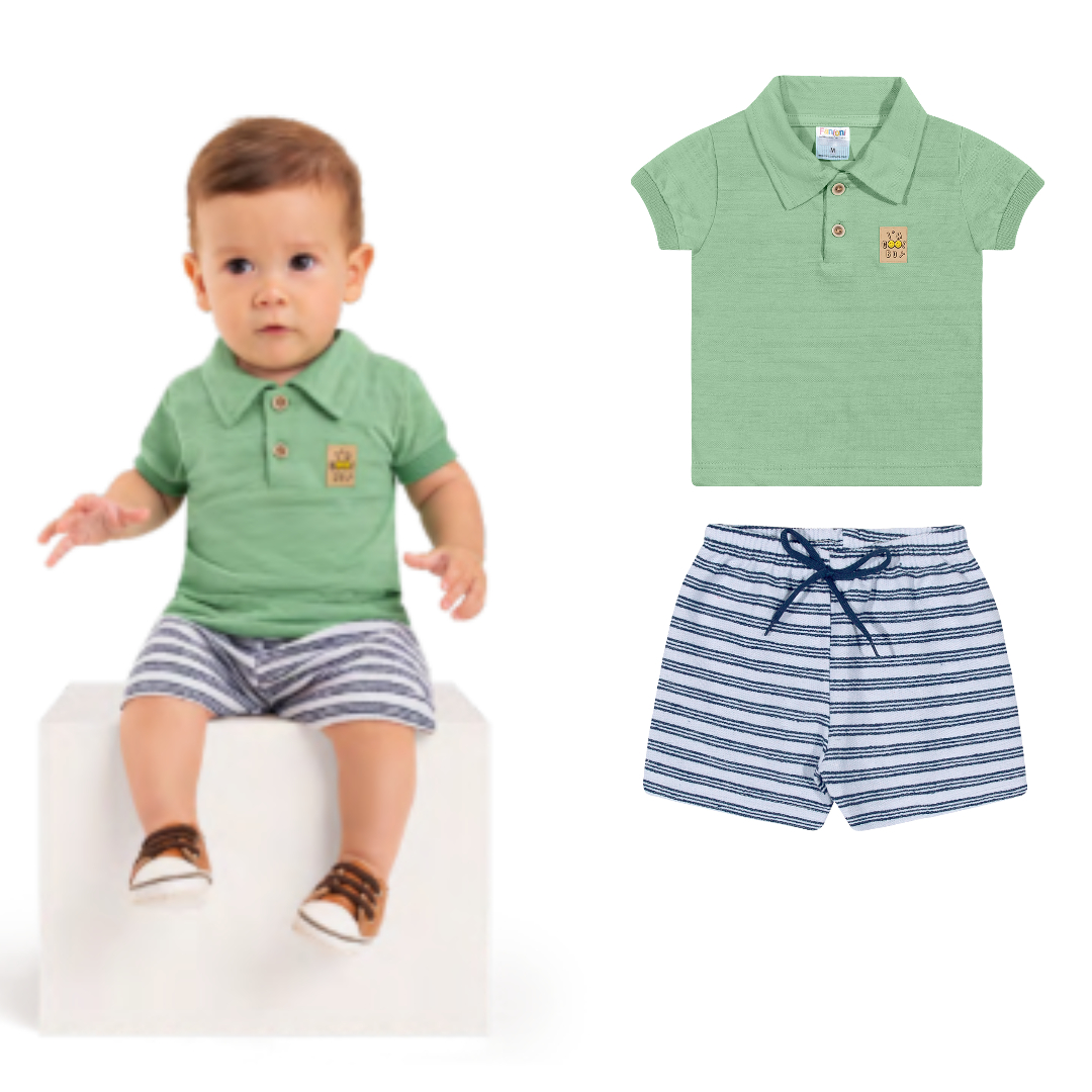 Conjunto Bebê Menino Camiseta Gola Polo Confeccionado em tecido Meia Malha Boho | Ribana Canelada e Bermuda Moletinho Ecológico Listrado.