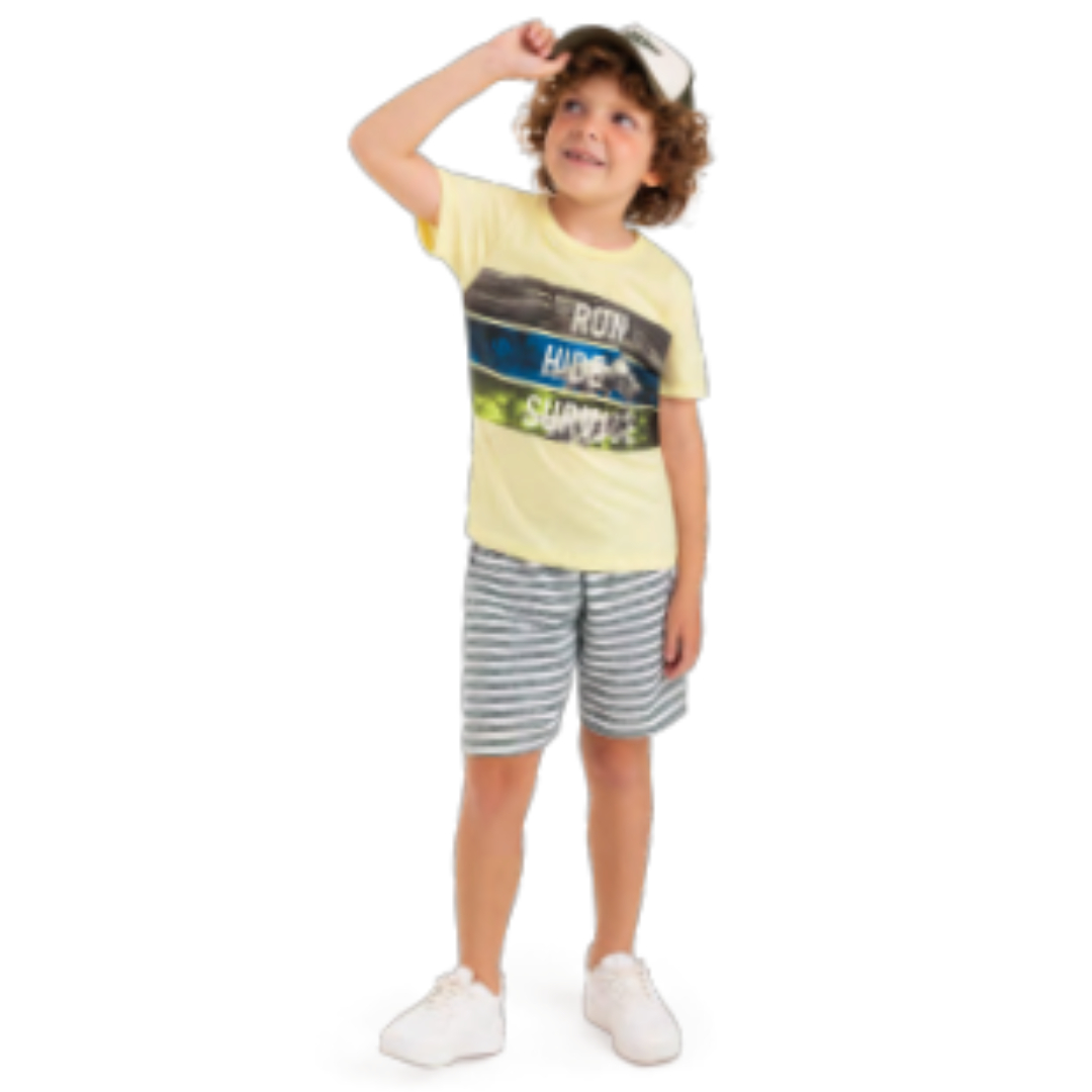 Conjunto Camiseta Meia Malha Fio Penteado + Bermuda Moletinho Ecológico Listrado.
