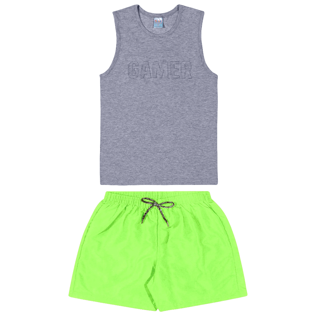 Conjunto Machão com Embossing Meia Malha Mescla Escuro E Short Tactel Acqua Print Verde.